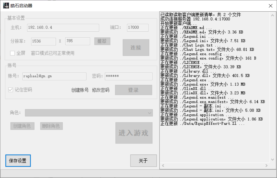 打开Legend.exe登录,新注册帐号raphael@gm.gm,密码123456,用此帐号可登录并具备管理员权限。用管理员帐号登录,在聊天栏输入@仅限管理员登录 false,开启非管理员登录。